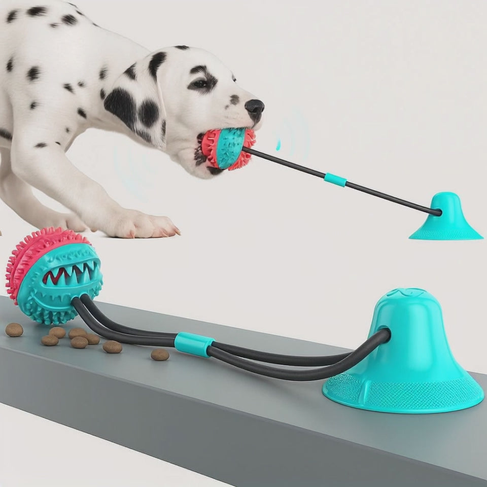 Der integrierte Saugnapf hält den Ball fest auf glatten Oberflächen – so kann dein Hund nicht einfach den ganzen Ball durch den Raum zerren, sondern muss aktiv daran knabbern und ziehen.